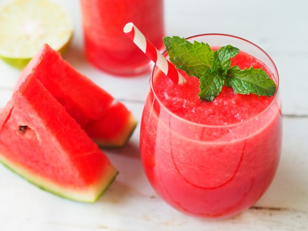 Wassermelone, Minze, Limettensaft und Rosè in einen Mixer geben und pürieren, bis die gefrorenen Wassermelonenwürfel zerkleinert sind.